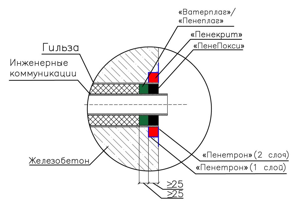 Далее инженерные коммуникации и гильзу очистить от остатков раствора, обезжирить растворителем и просушить. Пространство между инженерными коммуникациями и гильзой плотно, без разрывов, заполнить клеем‑герметиком «ПенеПокси». Глубина полимеризации «ПенеПокси» за 24 часа составляет 3мм, при температуре 20 °С. Штрабу вокруг металлической гильзы плотно заполнить растворной смесью «Пенекрит», предварительно увлажнив и загрунтовав поверхность бетона растворной смесью «Пенетрон» в один слой. Раствор «Пенекрит» и прилегающие бетонные поверхности обработать растворной смесью «Пенетрон» в два слоя.